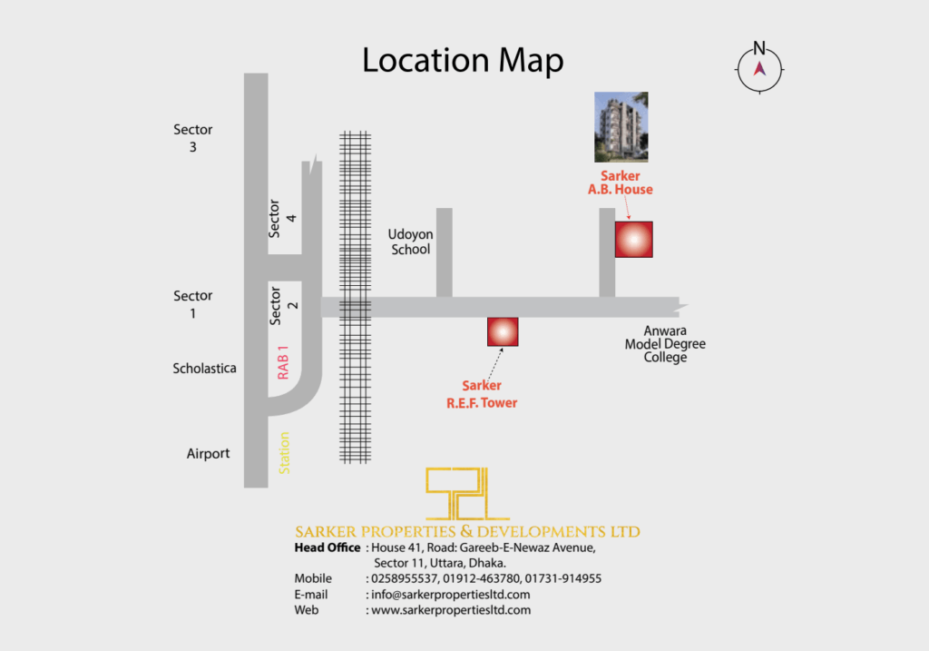 We feel pleasure in introduce Sarker A.B. House apartment at Dag No-5650 (Part), Mouza: Dashkinkhan, Majhibari road, Dhaka. Sarker A.B. House is 07 storied apartment building consisting of 12 apartments with 3 bedrooms, living room, dining area, 03 toilets, kitchen and 3 verandas.